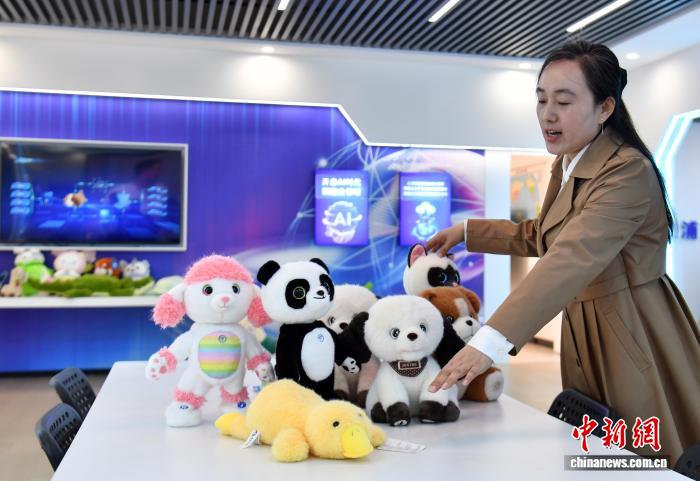 3月25日,河北雄安新区容乡县沉纺乡河北海收玩物无限公司内乱,任务职员正正在引见AI玩物早教伴随效力。中新社记者 韩冰 摄